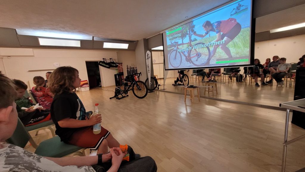 Mittags stärkten sich alle mit Pizza bevor es danach weiterging mit einem Vortrag zum Thema „Bikefitting“. Thomas Flak von TriMountain BikeBase führte Groß und Klein fachmännisch durch die Welt der Fahrradeinstellung.